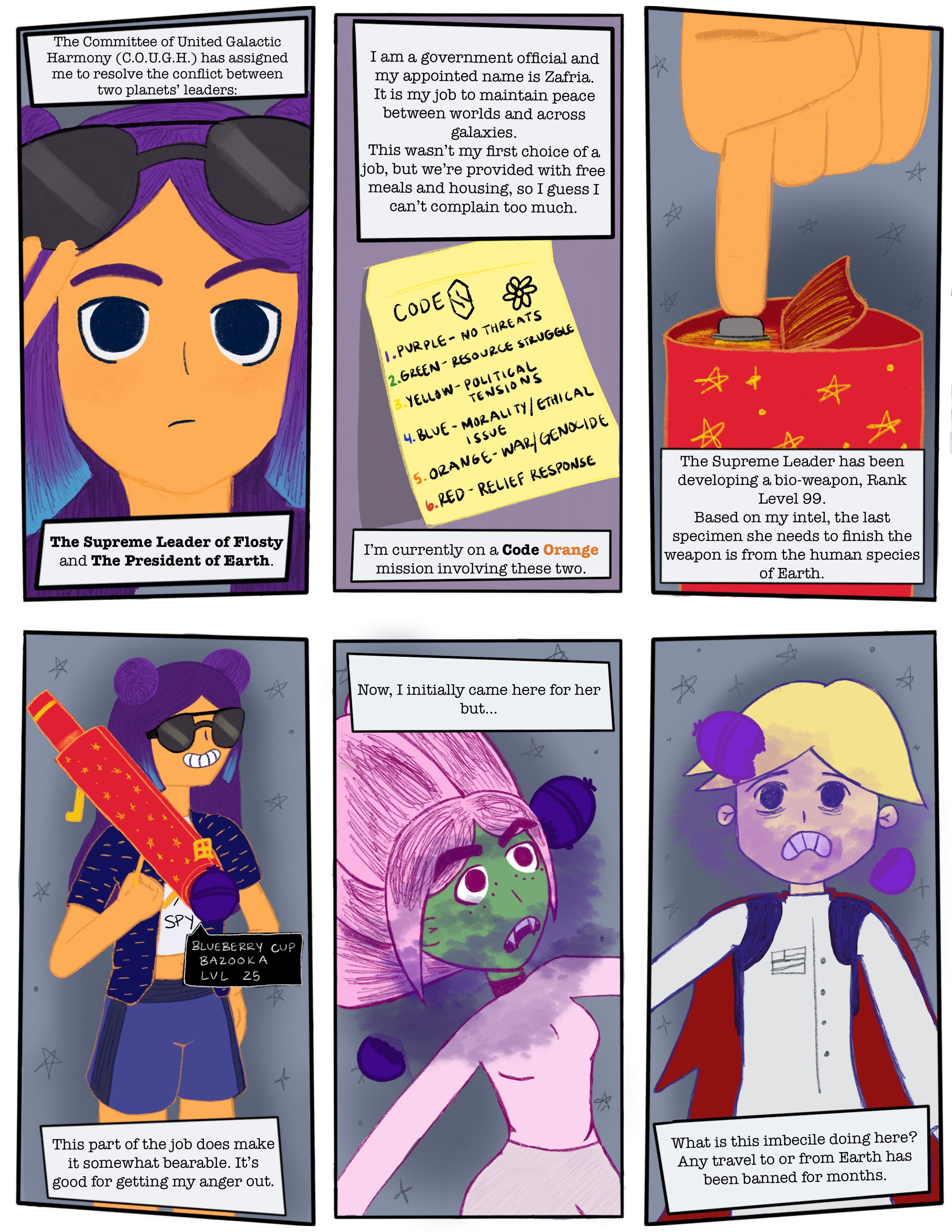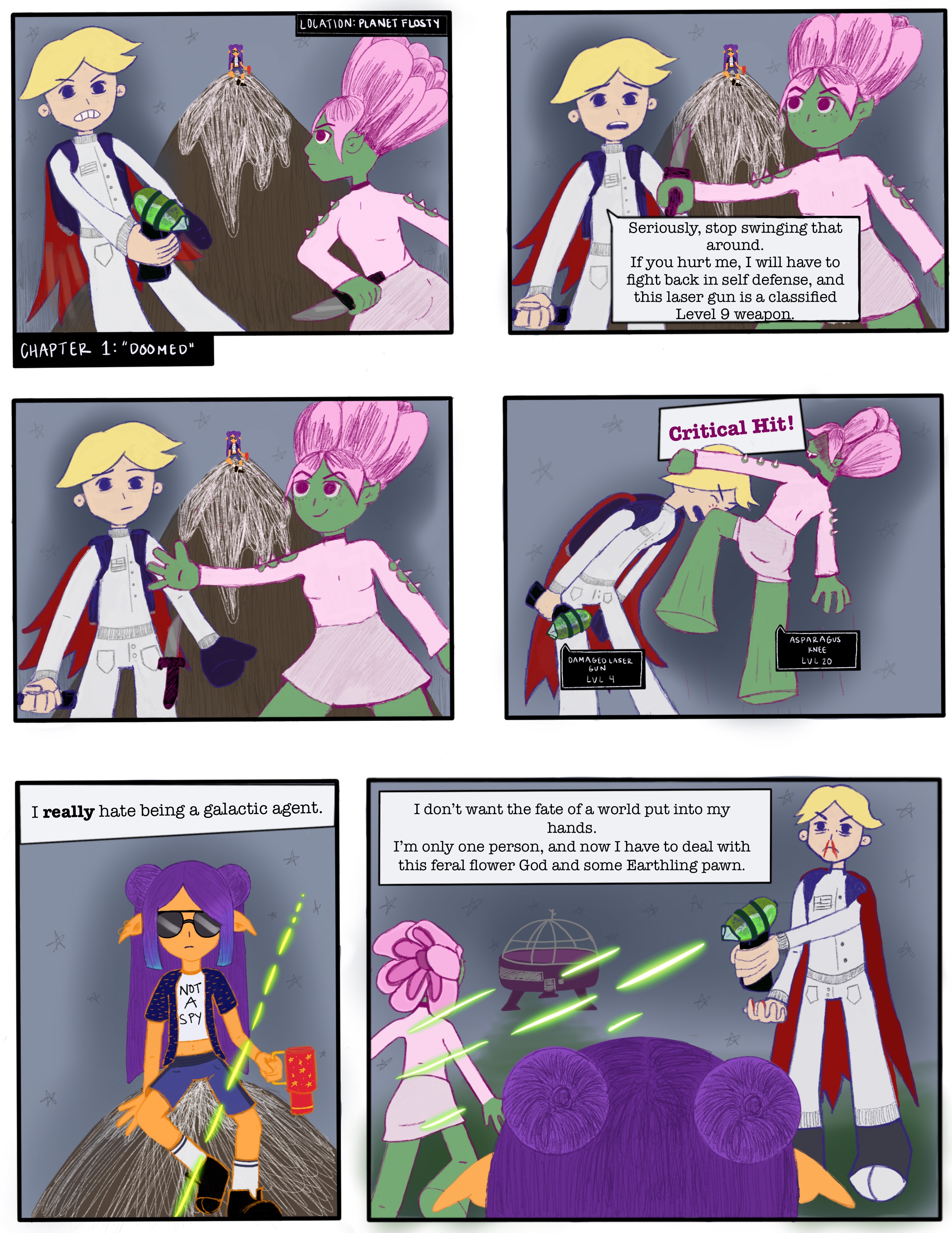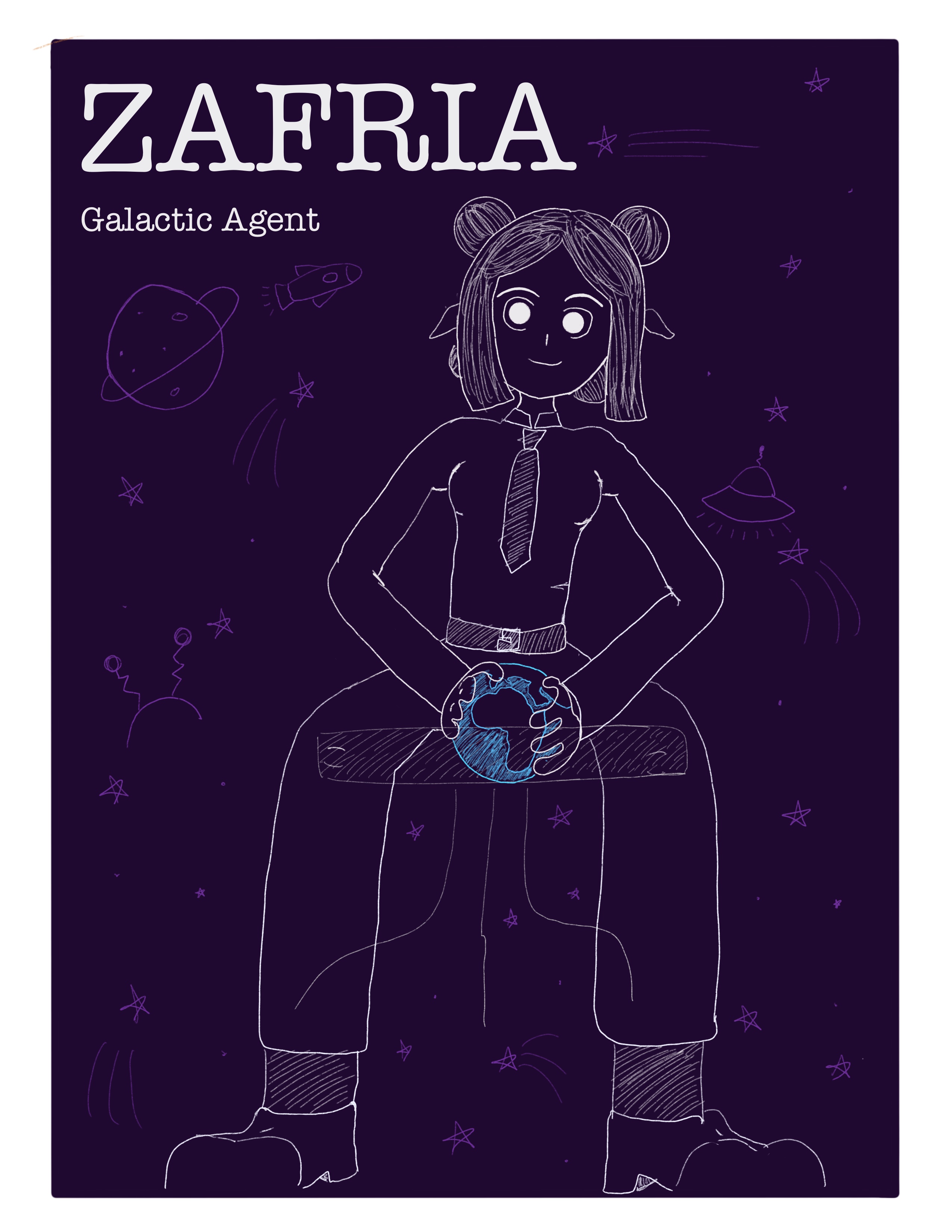 As a fan of fantasy and space, I created a comic about a sassy female agent who's job is to save the galaxy. She's thrown into an ordeal that is almost as difficult to deal with as an all-out war: a lover's quarrel. Drawn using Procreate.